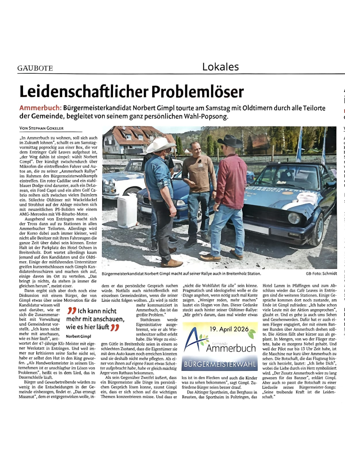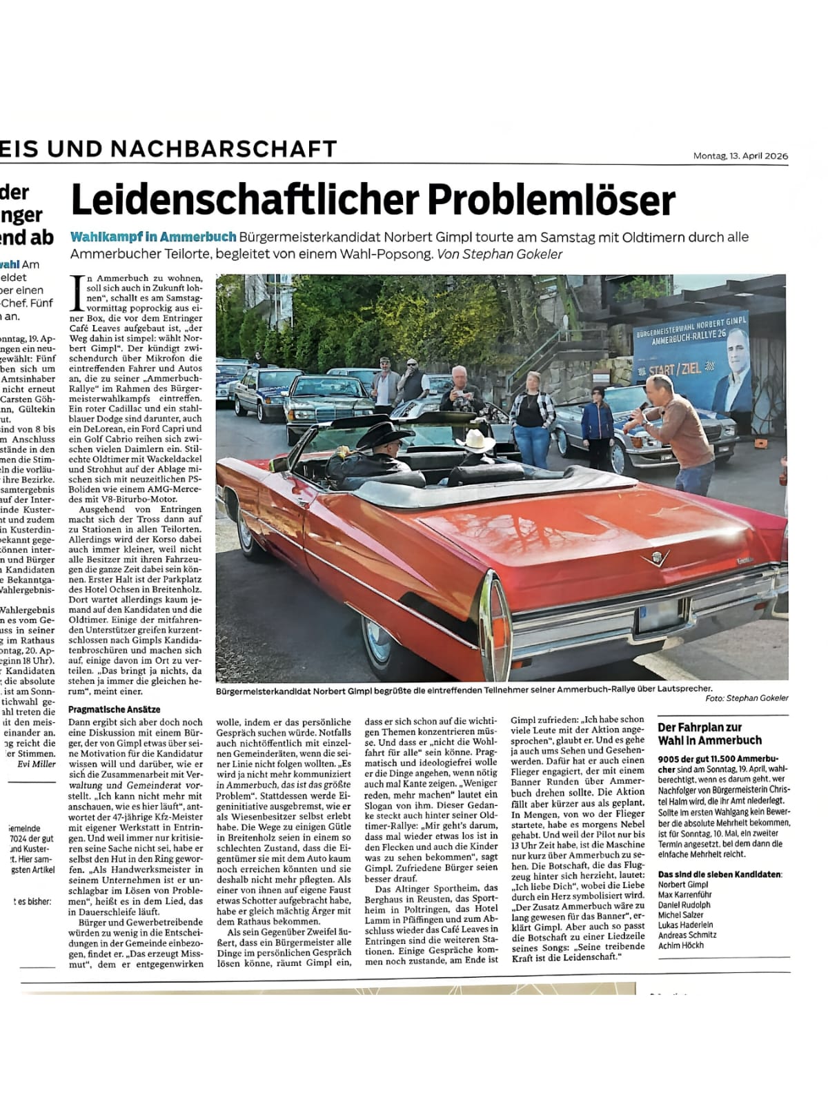 Kommen Sie vorbei, schauen Sie sich die tollen Oldtimer an und erzählen Sie mir, was Sie in Ihrem Ort bewegt.